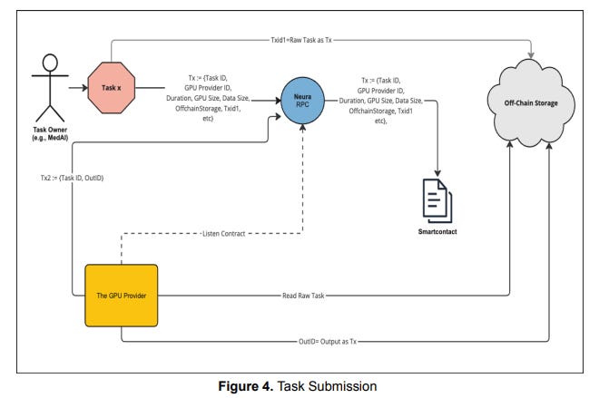 Task Submission: AI model owners encrypt their tasks and submit them to off-chain storage like Arweave or IPFS. These tasks are then processed by selected GPU providers who decrypt, execute, and return the results.