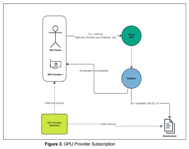 Decentralized Computing: Neura uses a network of distributed GPUs for AI training and inference. GPU providers register and make their resources available, which are then verified by validators to ensure reliability.